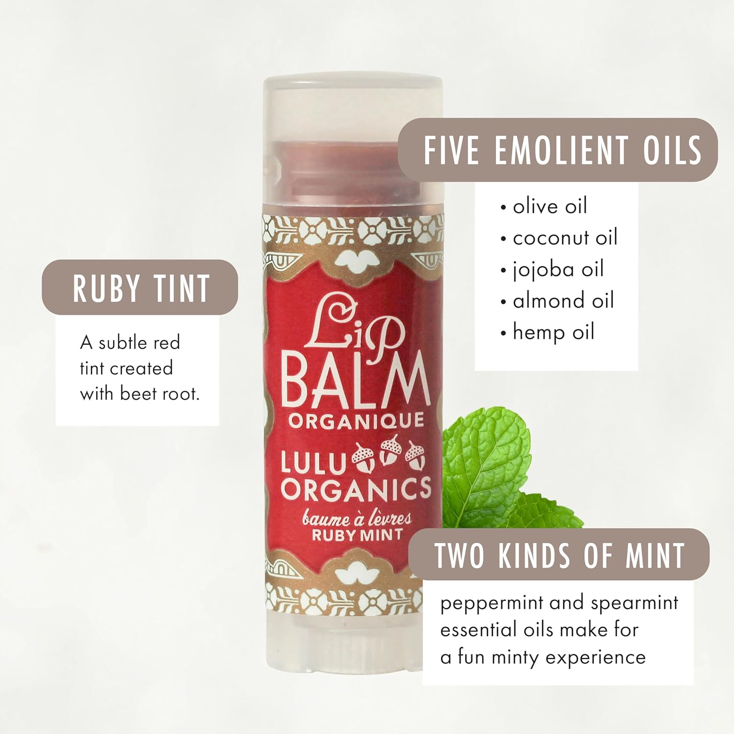 - Unique Elegance and Luxurious Scents: Lulu Organics Lip Balm offers an exquisite ruby mint option, ideal for those who appreciate a refreshing and invigorating scent. This nourishing and moisturizing lip balm is designed to provide long-lasting hydration, making it a standout in your lip care regimen. With its luxurious formula, it sets itself apart from ordinary lip balms, ensuring your lips stay soft and well-cared-for throughout the day.
