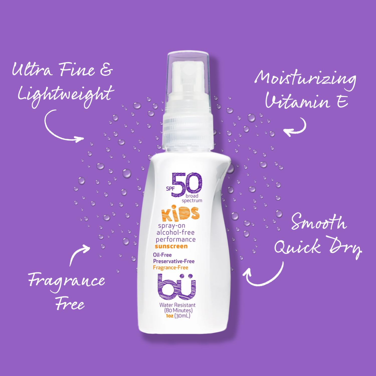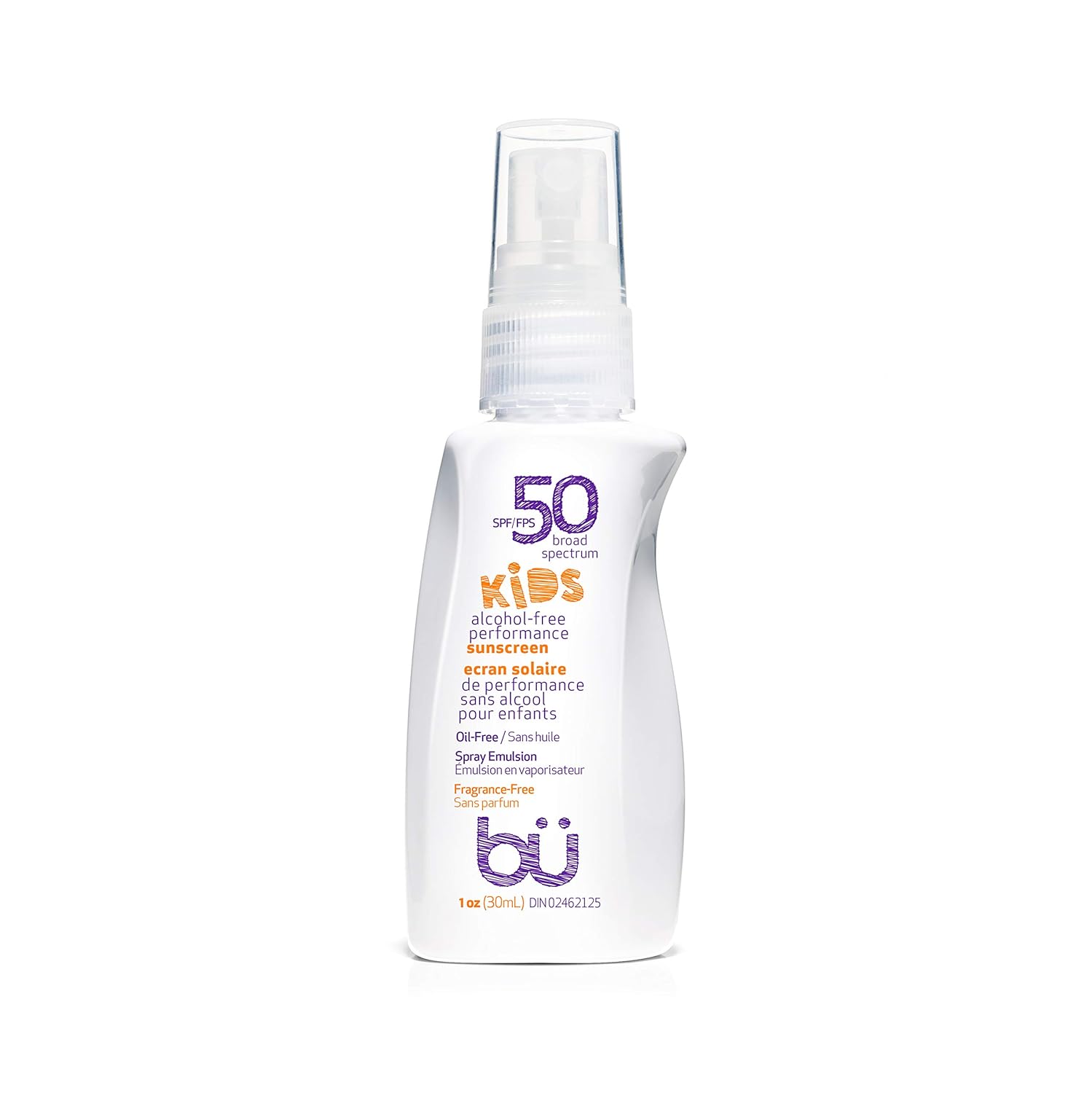 BU SPF 50 Kids Sunscreen Spray for Face and Body, Non Aerosol Spray, TSA Travel Size Sunscreen, Clear, Non Greasy, Water Resistant, Oil Free, Fragrance Free 1 oz
