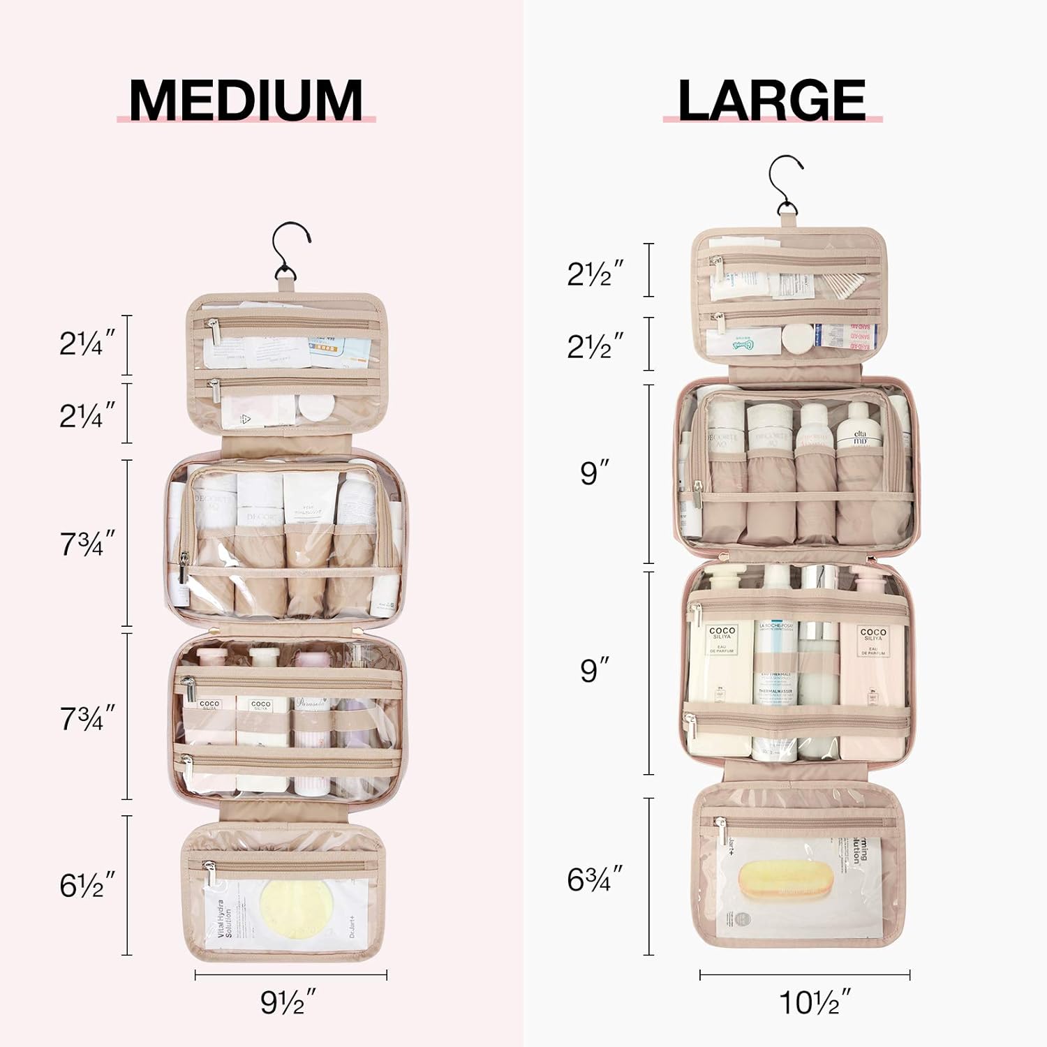 - ๐๐๐ซ๐ ๐ ๐๐๐ฉ๐๐๐ข๐ญ๐ฒ: Medium size: Rolled - 11'' x 3.7" x 7.9"; Opened - 9.5'' x 4" x 26.5; Large size :Rolled: 12.2'' x 4" x 9"; Opened: 10.5'' x 4" x 29.8. 4 separate compartments with 1 TSA-approved cosmetic bag