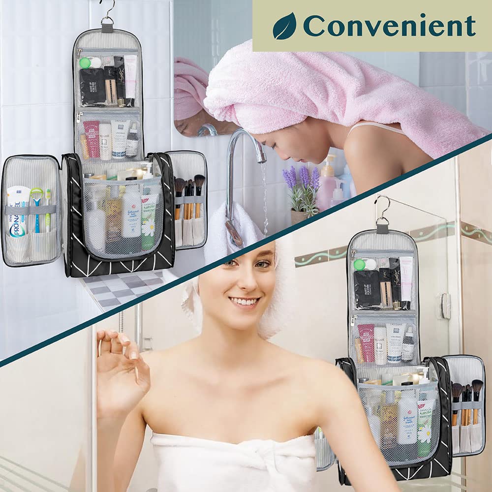 - COSMETICS TRAVEL BAG ORGANIZER: This toiletry bag for women has a hanging hook and multiple pockets that help you stay organizer during business trip, vacation travel. The hanging hook makes it easy to hang the toiletry bag to bars in the hotel shower bathroom. Unzip your toiletry bag to reveal compartments to organize your shampoo, skincare face hygiene products. This toiletry travel bag is an essential accessory for cruise in Europe, plane, Hawaii Trip, and honeymoon.