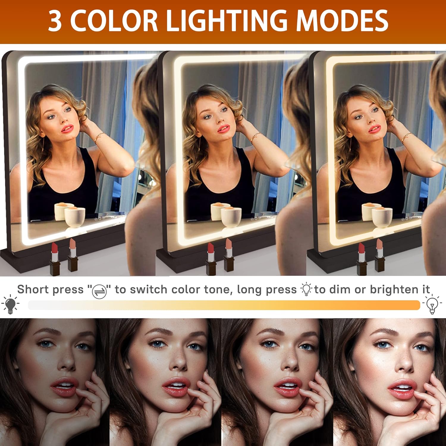 - đăBrightness Adjustable and 3 Color Lighting ModesăHASIPU lighted makeup mirror surrounded by 50,000 hours life Max 6000 Lumens high brightness LED Light Strip, with warm /natural /cold white three-tone settings, adjustable brightness 0%-100% can meet your personal makeup requirement.