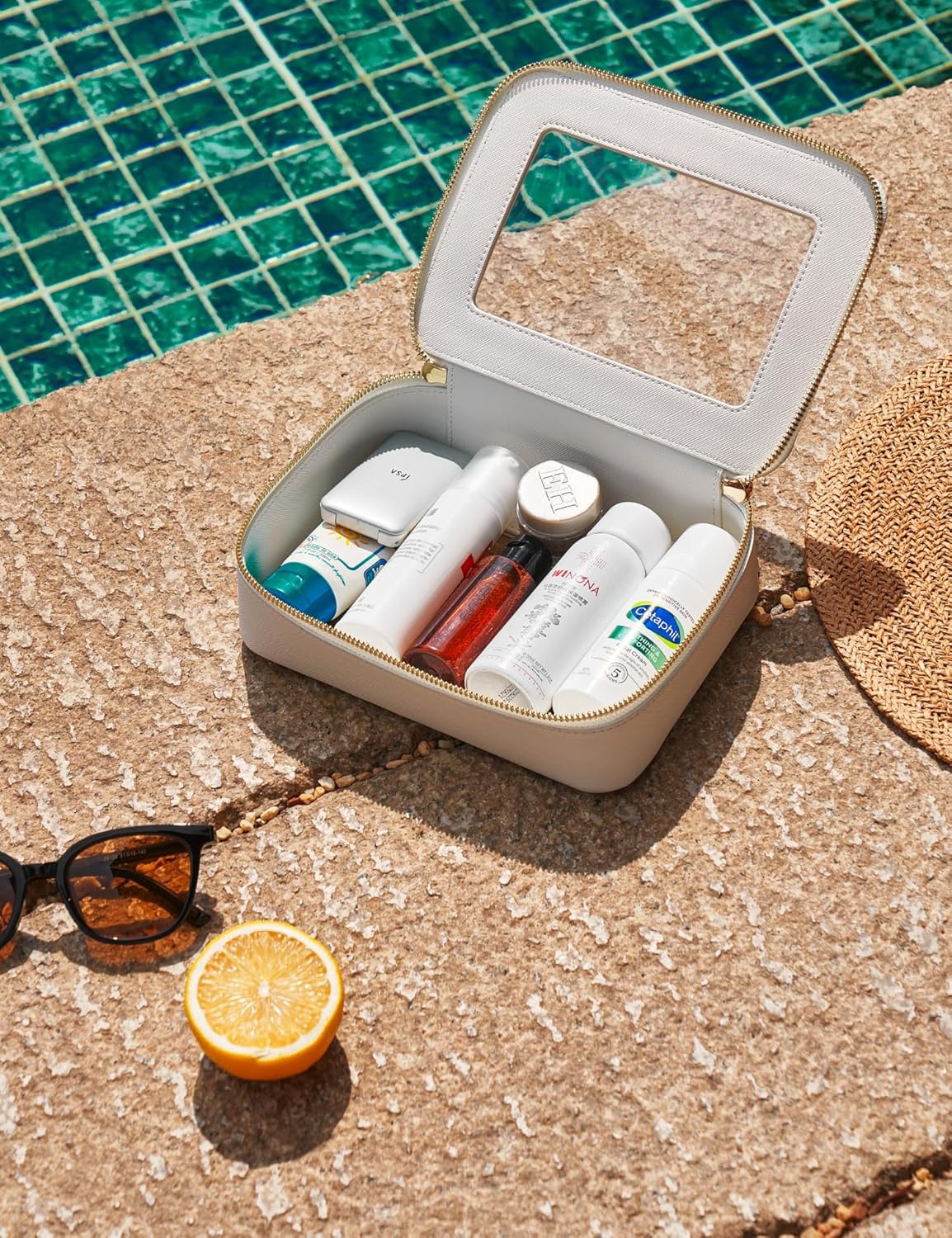- [Premium Material and Durability] – The clear cosmetic case, both the exterior and interior, is crafted from high-grade saffiano faux leather, which is highly scratch resistant, durable and exceptionally easy to keep clean. It features a smooth zipper for secure closure, and elegant light gold metal hardware accents, adding a luxurious and sophisticated touch to the bag's overall design.