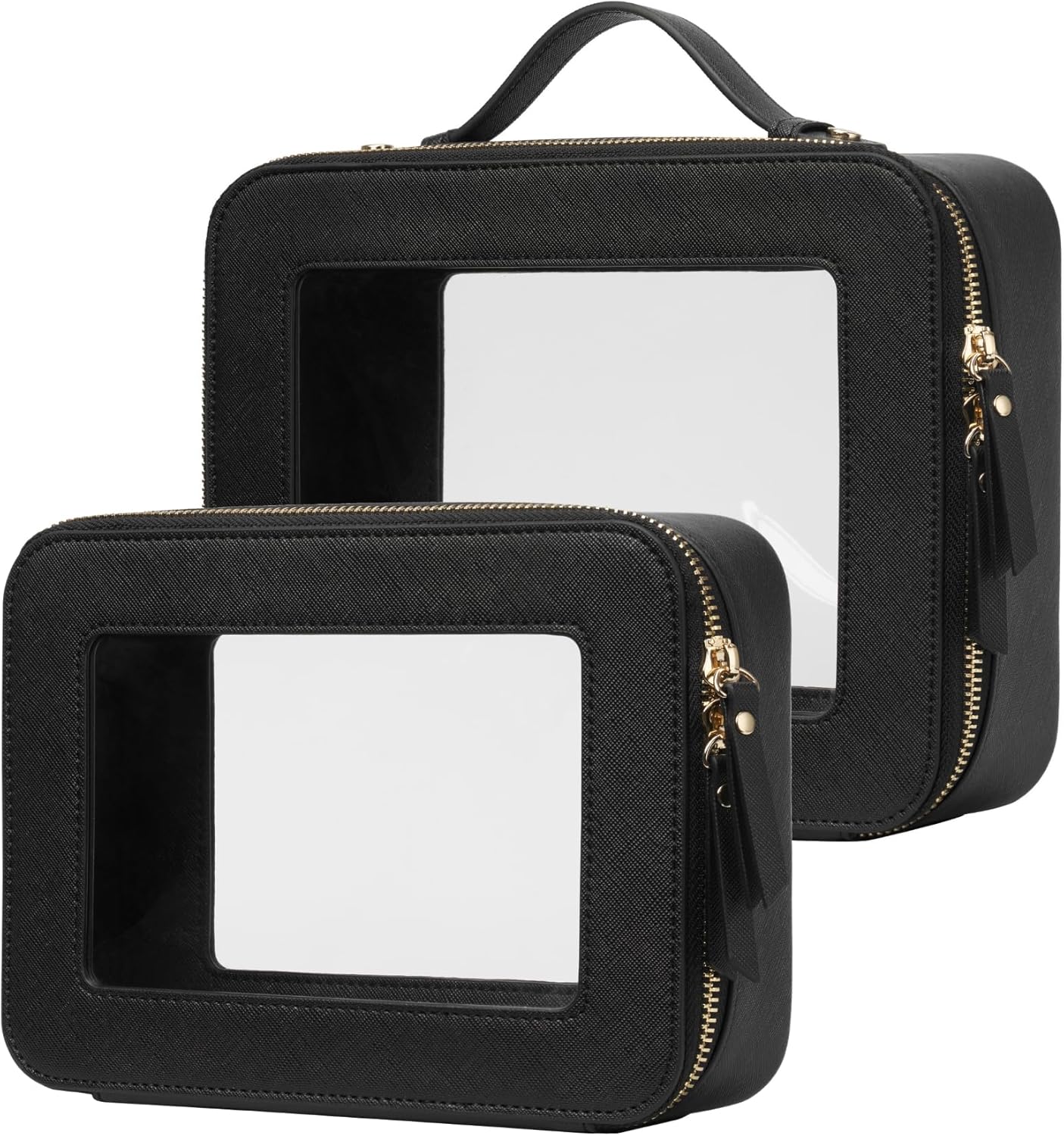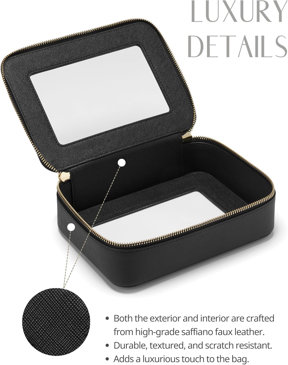 - [Premium Material and Durability] โ The clear cosmetic case, both the exterior and interior, is crafted from high-grade saffiano faux leather, which is highly scratch resistant, durable and exceptionally easy to keep clean. It features a smooth zipper for secure closure, and elegant light gold metal hardware accents, adding a luxurious and sophisticated touch to the bag's overall design.