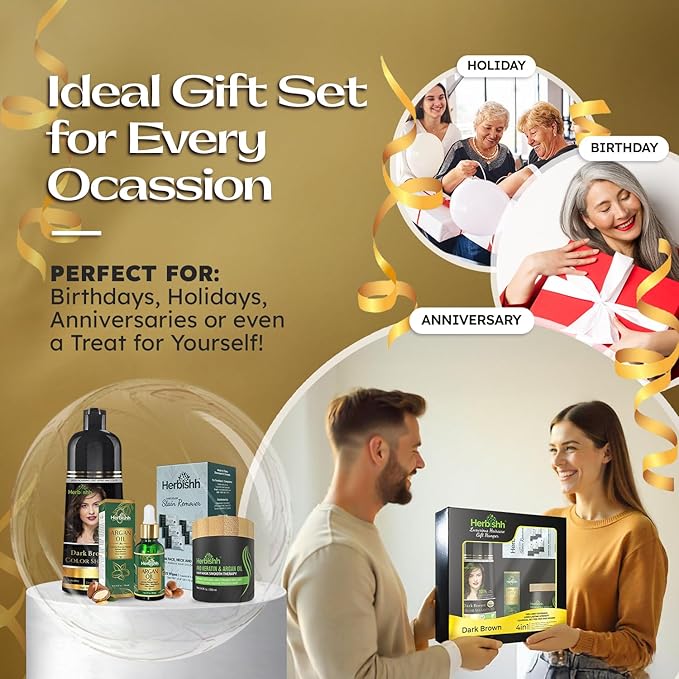 - DARK BROWN HAIR DYE SHAMPOO: This holiday hair care gift set has 3-in-1 shampoo that not only dyes but also conditions and nourishes your hair. Cover gray strands effortlessly with long-lasting, rich color that lasts up to 2-3 weeks.