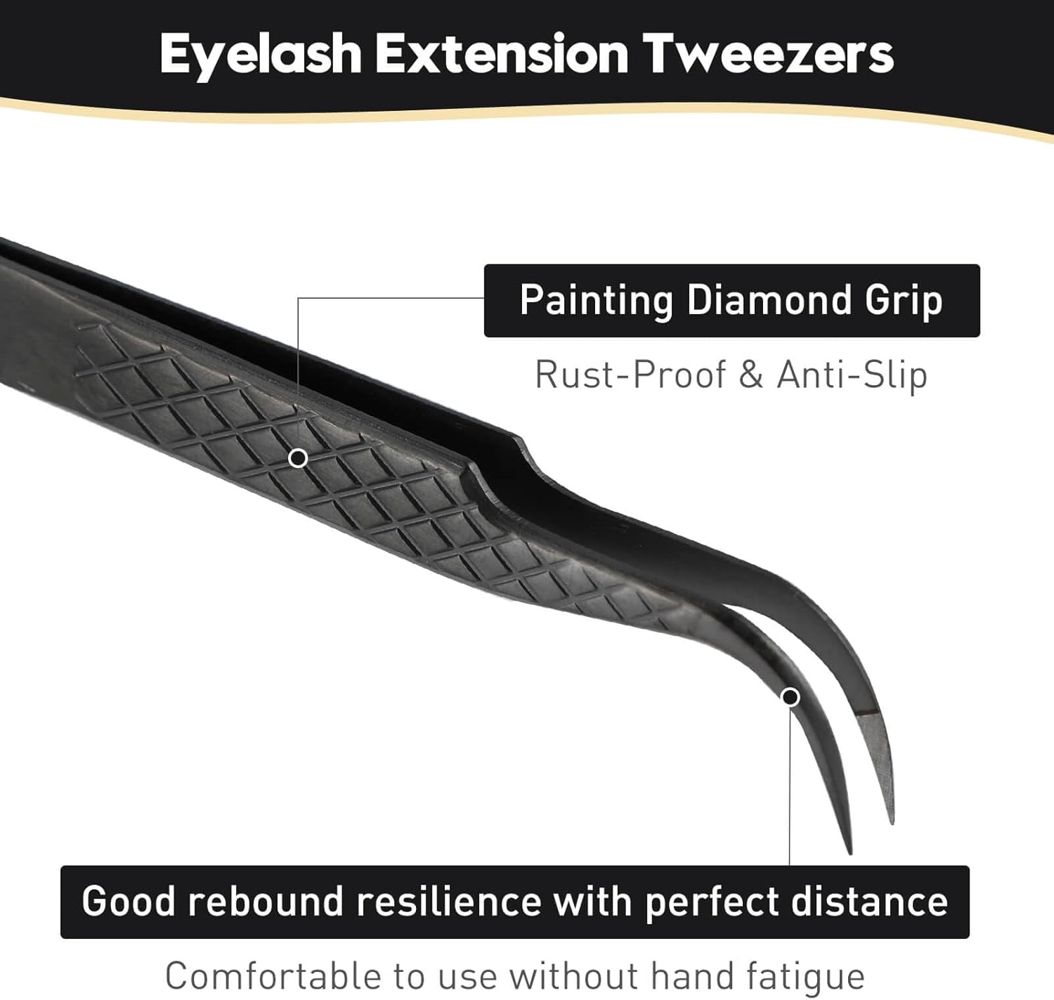 Ms.Queen Eyelash Tweezers For Extensions, Precision Diamond Grip Curved Lash Tweezers Fiber Tip,Black