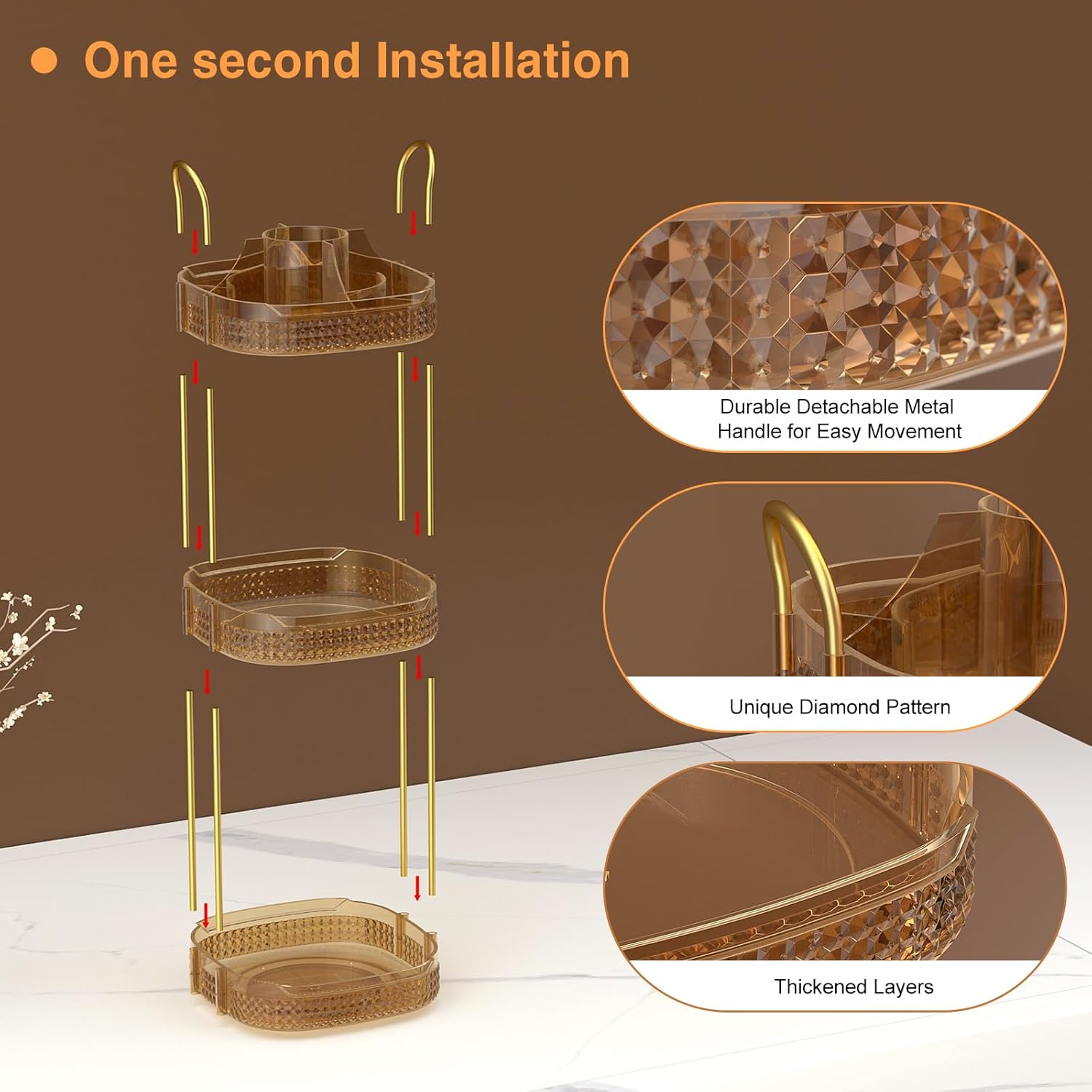 - 360 Degree Rotation& Easy to Install:➤Reinforced steady base rotates smoothly and silently, the rotating makeup organizer is easy access to all of your make-up in seconds.Less installation step are required other than inserting metal rack and handle,do not worry about repeated disassembly to shorten the lifetime of the makeup organizer.