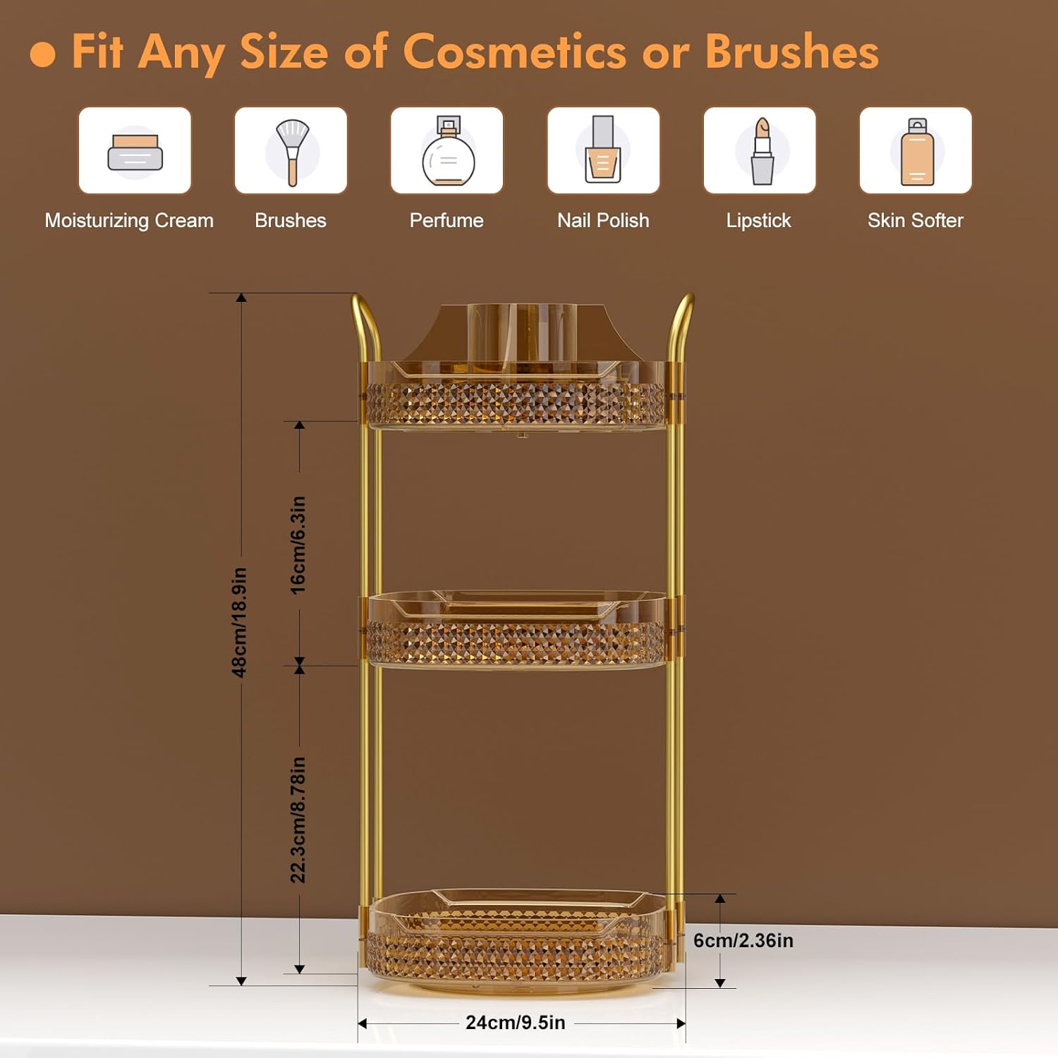 - Washable and Metal Stand:➤Awenia cosmetic organizer with clear acrylic material can be washed or wiped with a damp cloth,cleaned as good as new.Gold stainless steel stand and unique diamond pattern make the perfume organizer more strong,firm beautiful and easy to move. The 360 makeup organizer can be place in Dresser,Bathroom and Kitchen.