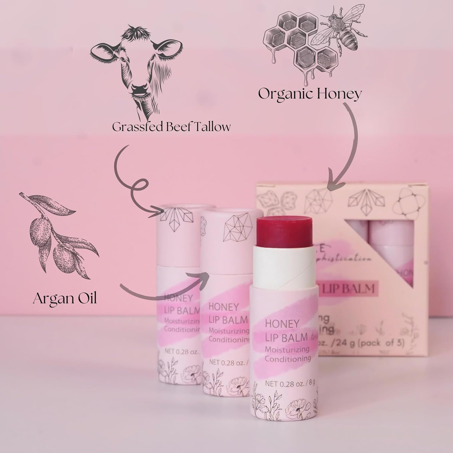 - 100% Natural, Organic, Ecofriendly: Our lip balm is made with only the finest, most natural ingredients. We use 100% grassfed beef tallow, organic raw honey, and argan oil to create a luxurious and nourishing lip balm that is free from harmful chemicals, paraffin, and synthetic fragrances.