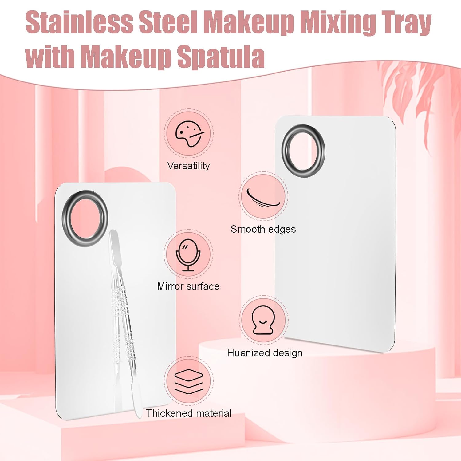 - 6.【Makeup Mixing Palette】Stainless steel metal mixing tray with spatula artist tool for mixing foundation nail-art, 4.53*3 inches size, light and small, easy to carry, pre-drilled round holes are easy to grasp the makeup palette.