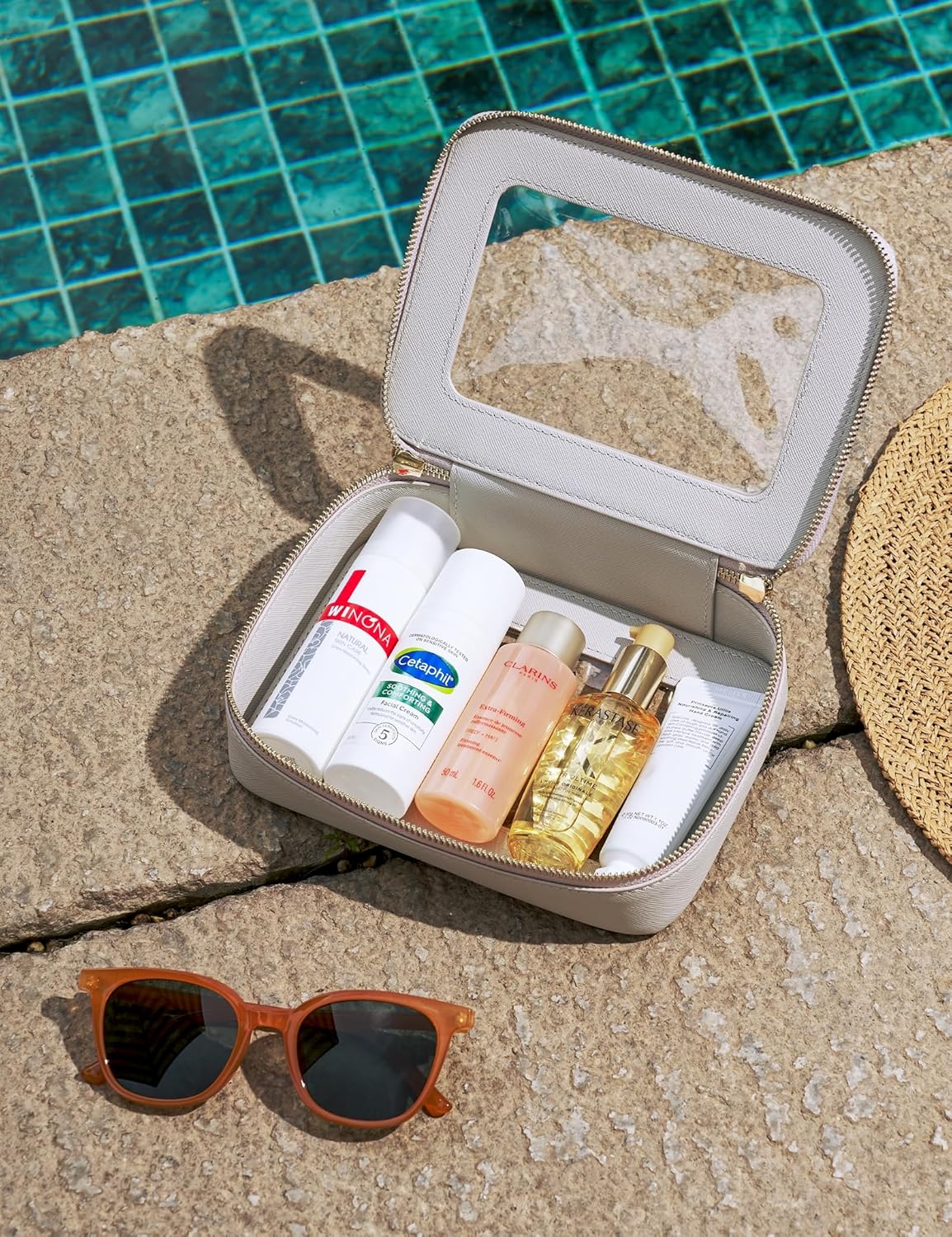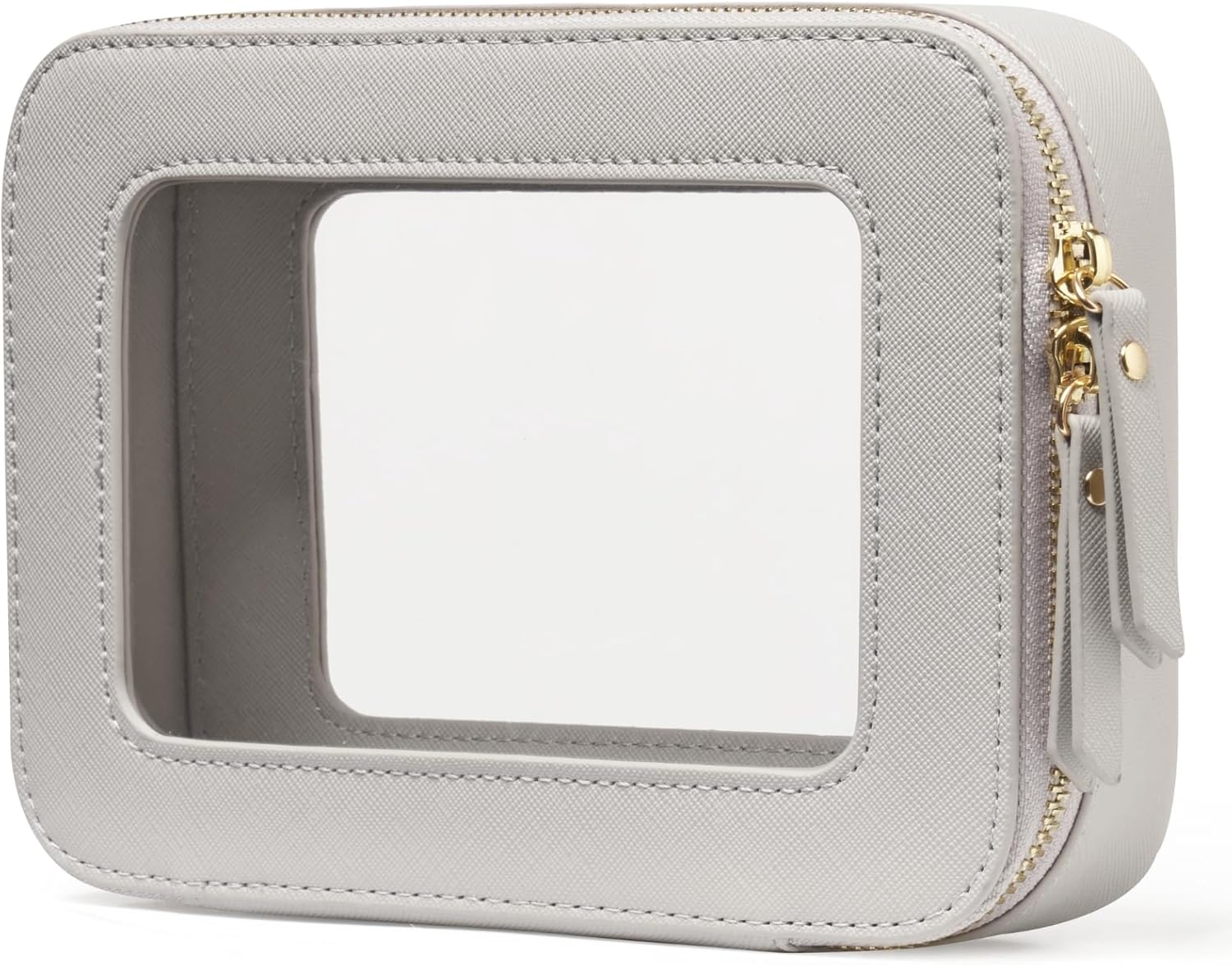 - [Premium Quality] - This clear medium cosmetic case is crafted from high-grade saffiano faux leather, making it highly scratch-resistant, durable, and easy to clean. It features a smooth zipper for secure closure and elegant light gold metal accents for a luxurious touch.