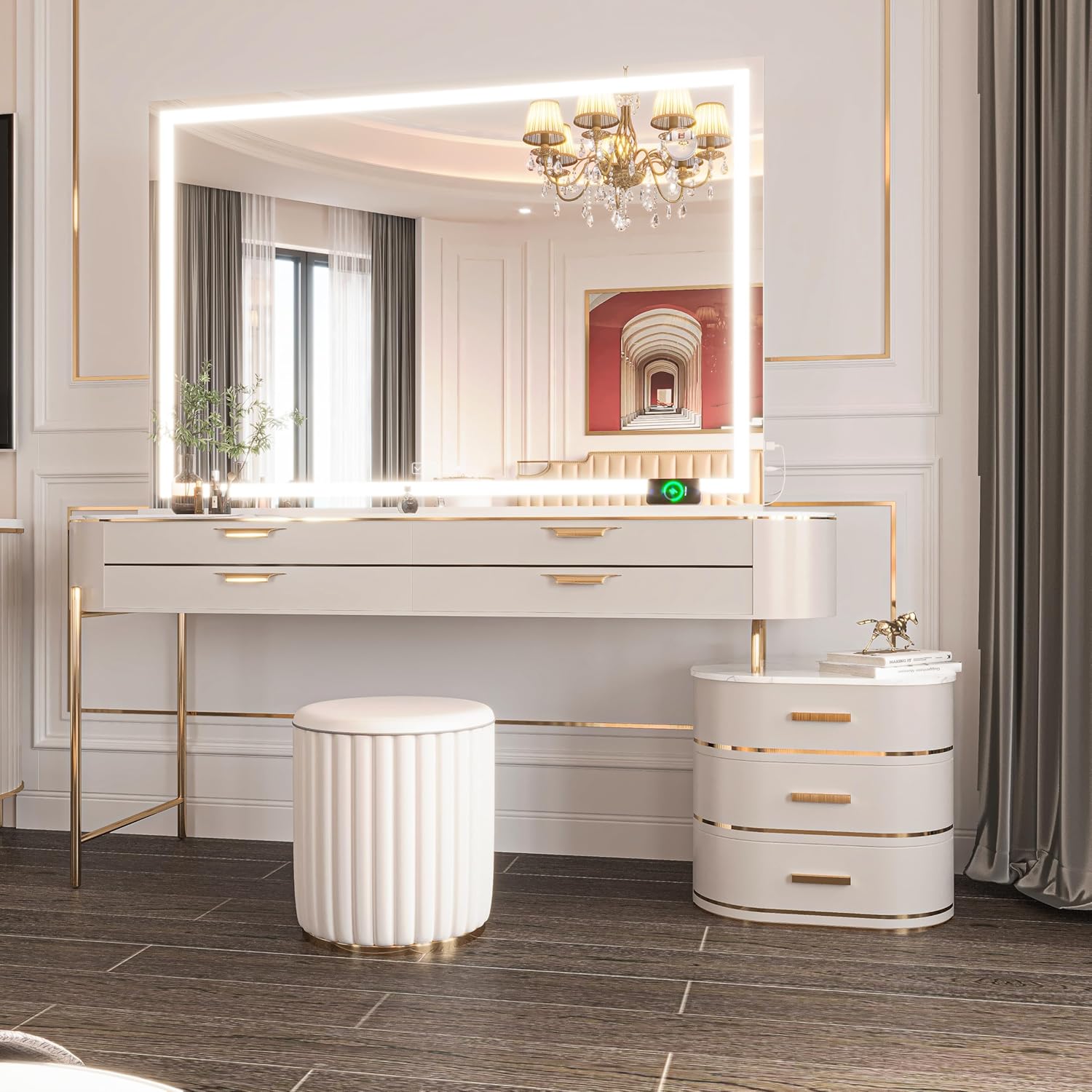 Hasipu Vanity Mirror with Lights and Bluetooth Speaker, 50" x 33.9" LED Makeup Mirror, Lighted Makeup Mirror with Dimmable 3 Modes, Touch Screen Control Vanity Mirror Square White