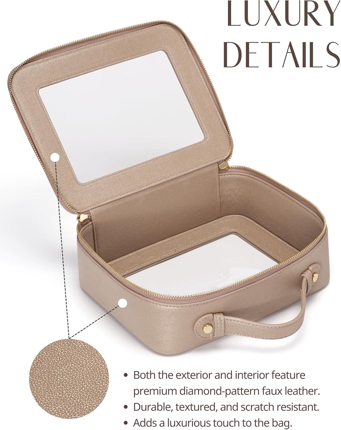 - [Premium Material and Durability] – The clear cosmetic case, both the exterior and interior, is crafted from high-grade saffiano faux leather, which is highly scratch resistant, durable and exceptionally easy to keep clean. It features a smooth zipper for secure closure, and elegant light gold metal hardware accents, adding a luxurious and sophisticated touch to the bag's overall design.