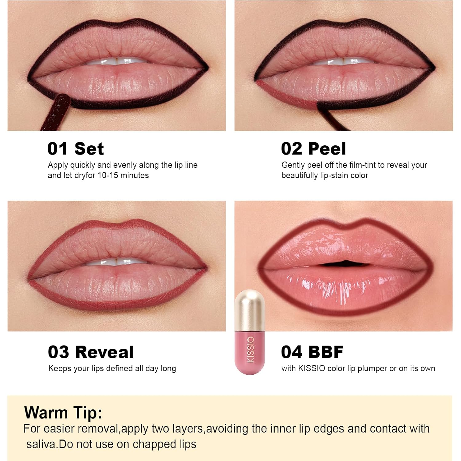 - Easy To Use:Clean lips and keep them dry,use the tip to trace an even layer along the lip line or apply to the entire lip, simply leave it on for 10-30 minutes - The longer it stays, the more the color settles.Allow the formula to set and slowly peel off the film and you'll have bright lip color for hours or even all day long - it won't transfer even when eating or drinking.Can use any oil-based makeup remover to easily remove your makeup