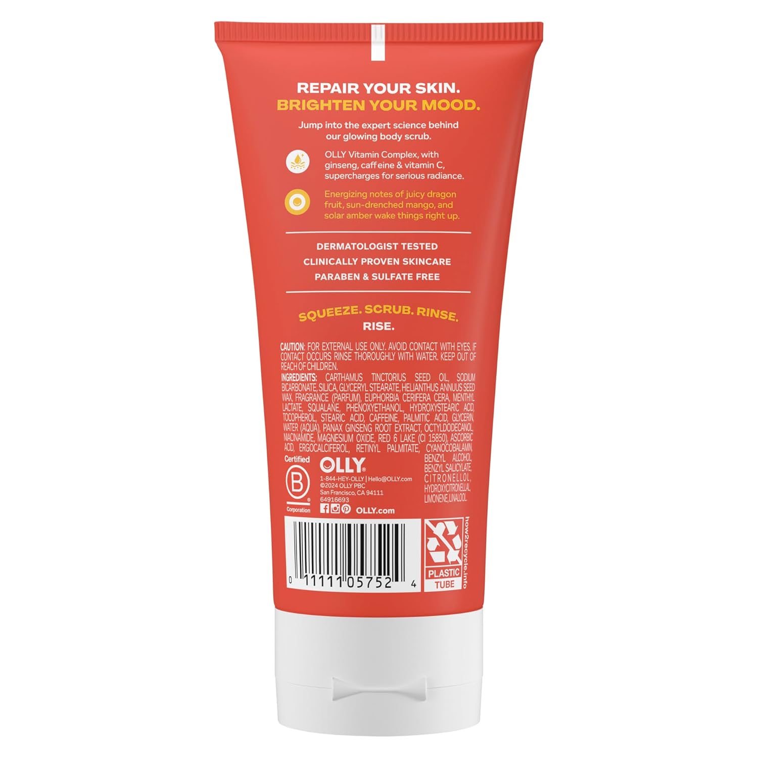 - Brighten Your Skin + Mood: OLLY CALM MOOD + SKIN Body Scrub is scientifically formulated to repair your skin barrier, while mood-transforming fragrances are proven to help boost your vibe