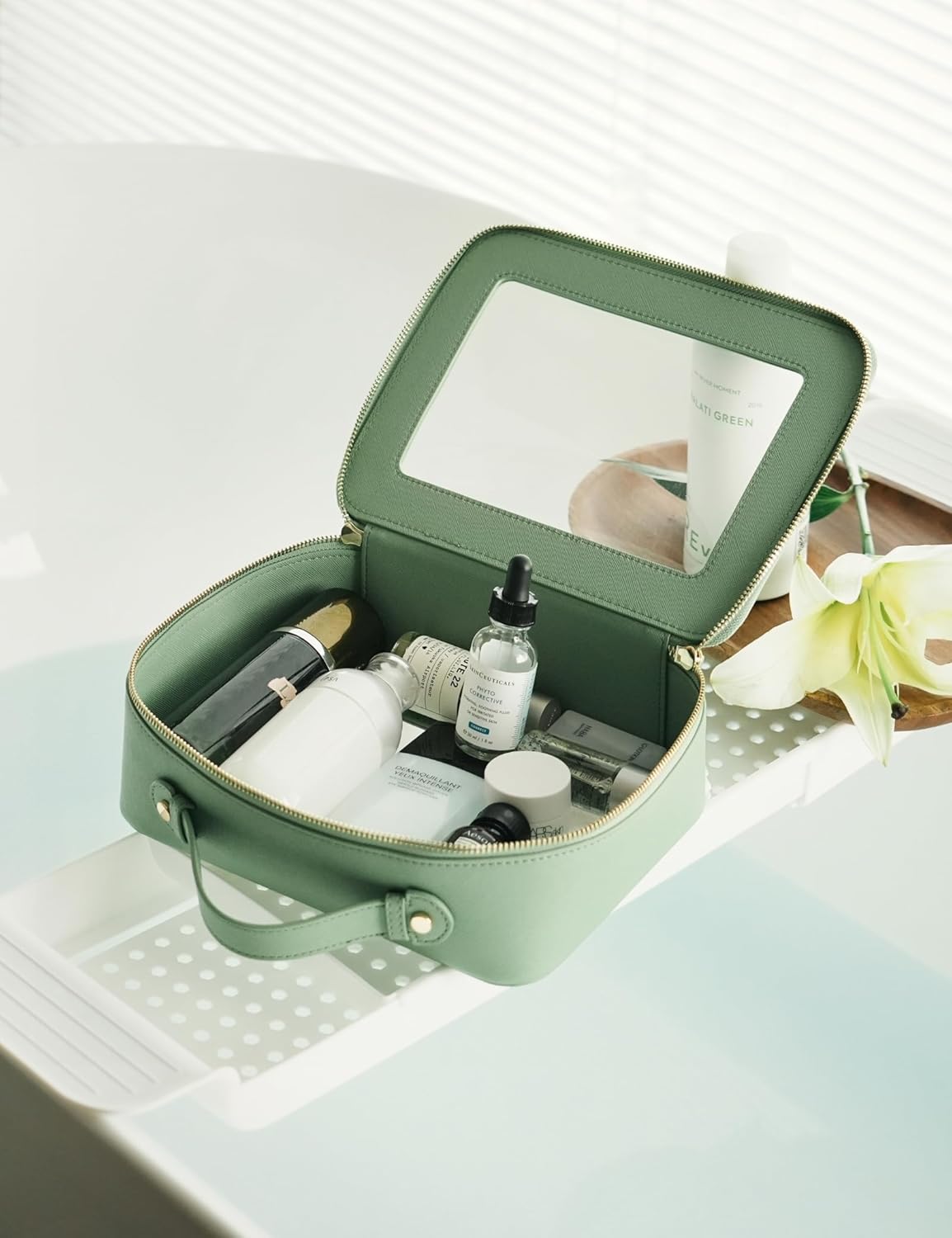 - [Spacious and Roomy] – The green travel make up bag measures 9.6'' x 7.5'' x 3.1'' (24.5cm x 19cm x 8cm), ideal for extended trips or situations where you need to carry a comprehensive collection of makeup and skincare products. It is designed to fit comfortably in suitcases and big travel bags.