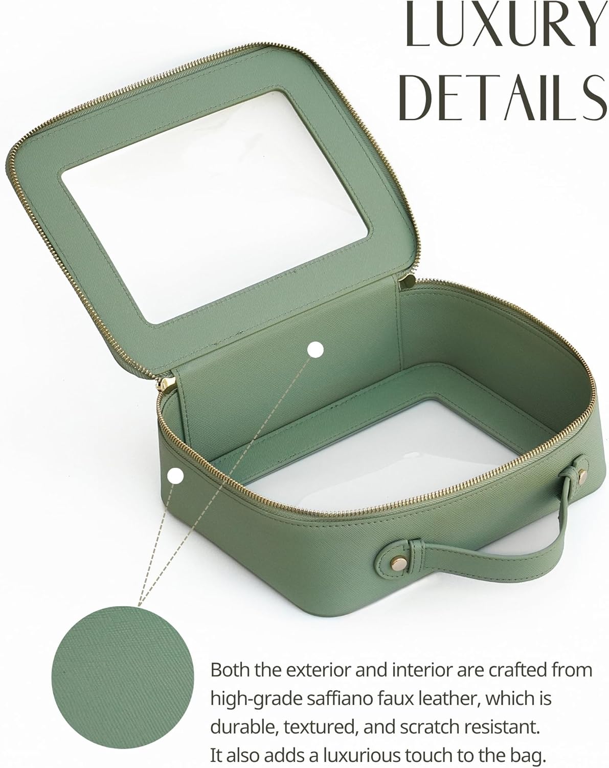 - [Premium Material and Durability] – The clear cosmetic case, both the exterior and interior, is crafted from high-grade saffiano faux leather, which is highly scratch resistant, durable and exceptionally easy to keep clean. It features a smooth zipper for secure closure, and elegant light gold metal hardware accents, adding a luxurious and sophisticated touch to the bag's overall design.