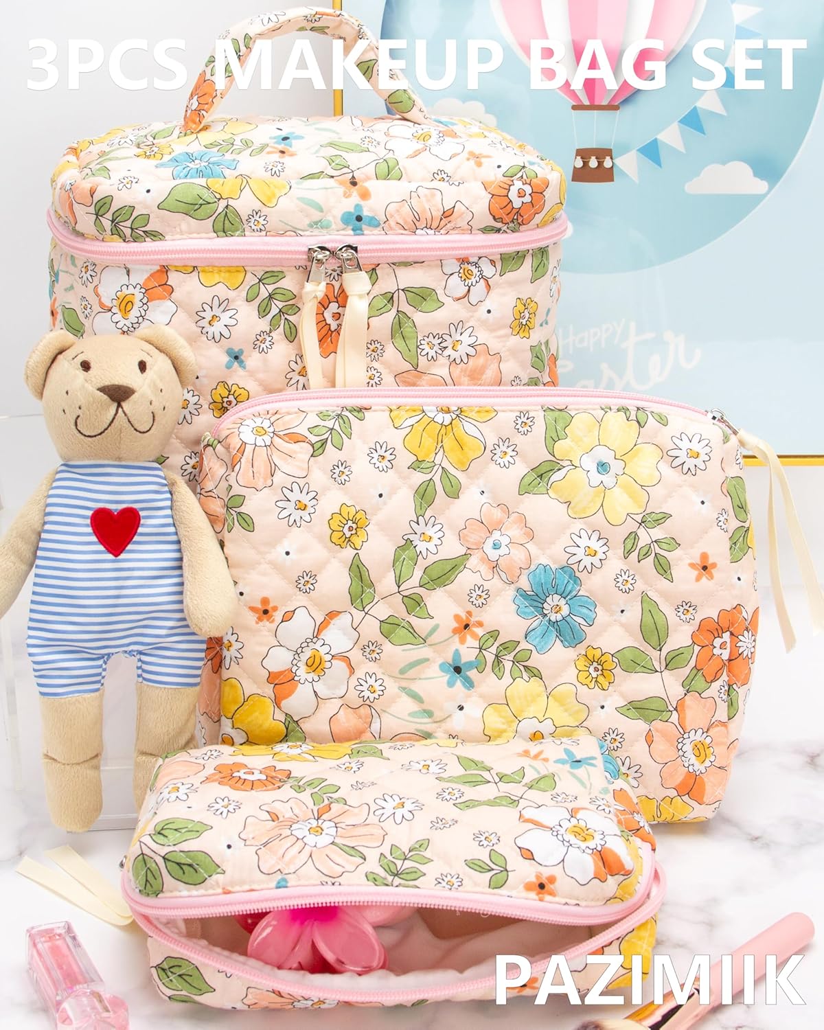 PAZIMIIK 3PCS Makeup Bag SET Large Travel Quilted Zipper Soft Cosmetic Case Pouch for Women Girls Make Up,Floral Orange