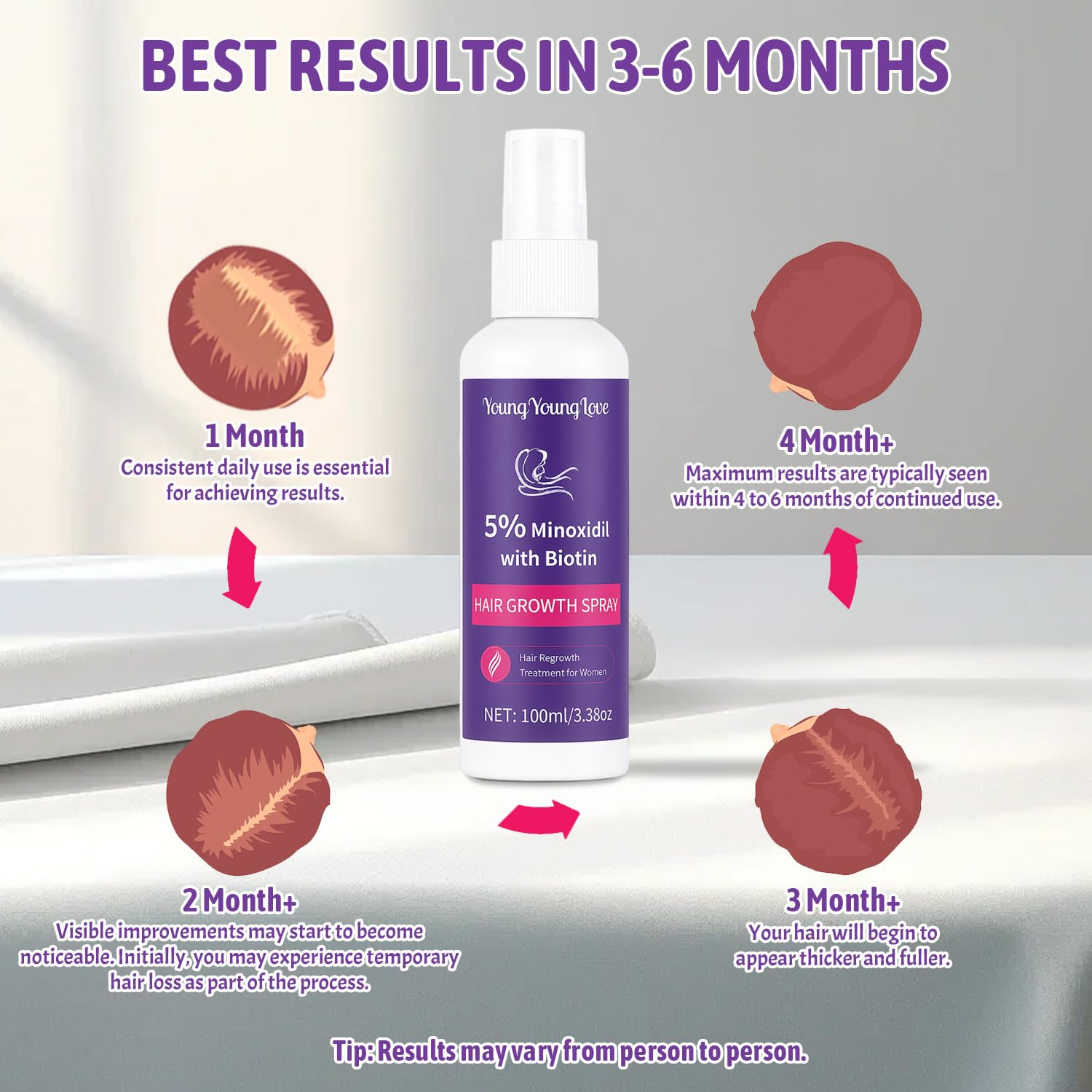 - Gentle Yet Effective for All Hair Types: Our Minoxidil spray delivers visible results in just 3 to 6 months. This formula is safe for daily use and suitable for all hair types. Whether your hair is straight, wavy, curly, or coarse, it nourishes from the root to promote healthy growth and reduce further damage.