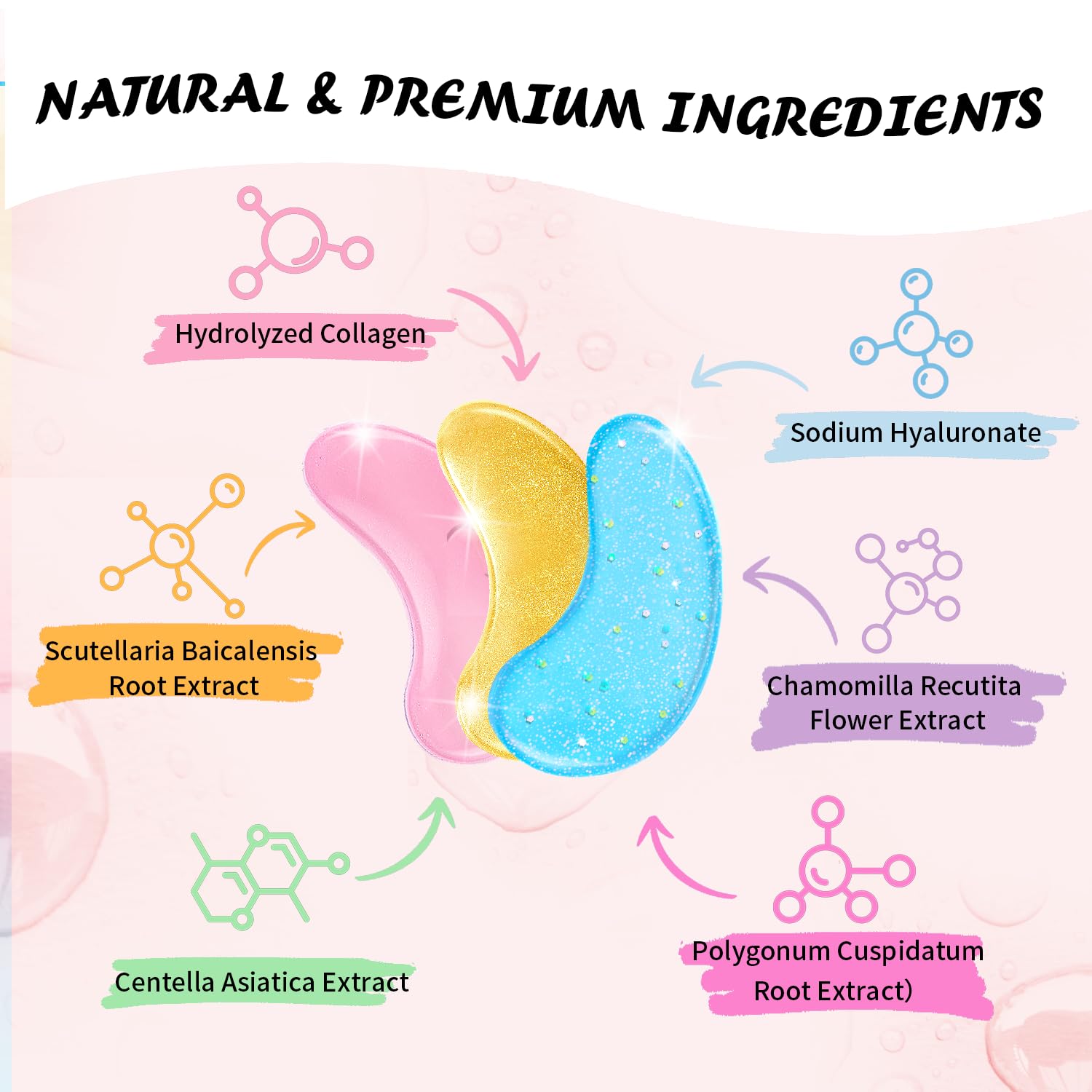 - Natural and Safe Ingredients: Our formula combines collagen, hyaluronic acid, and natural plant extracts, ensuring gentle yet effective care for the delicate eye area. Wake up to a refreshed, revitalized look with our gel eye masks—your secret to a bright, youthful gaze. Each pair is individually packaged to ensure maximum freshness and hygiene.