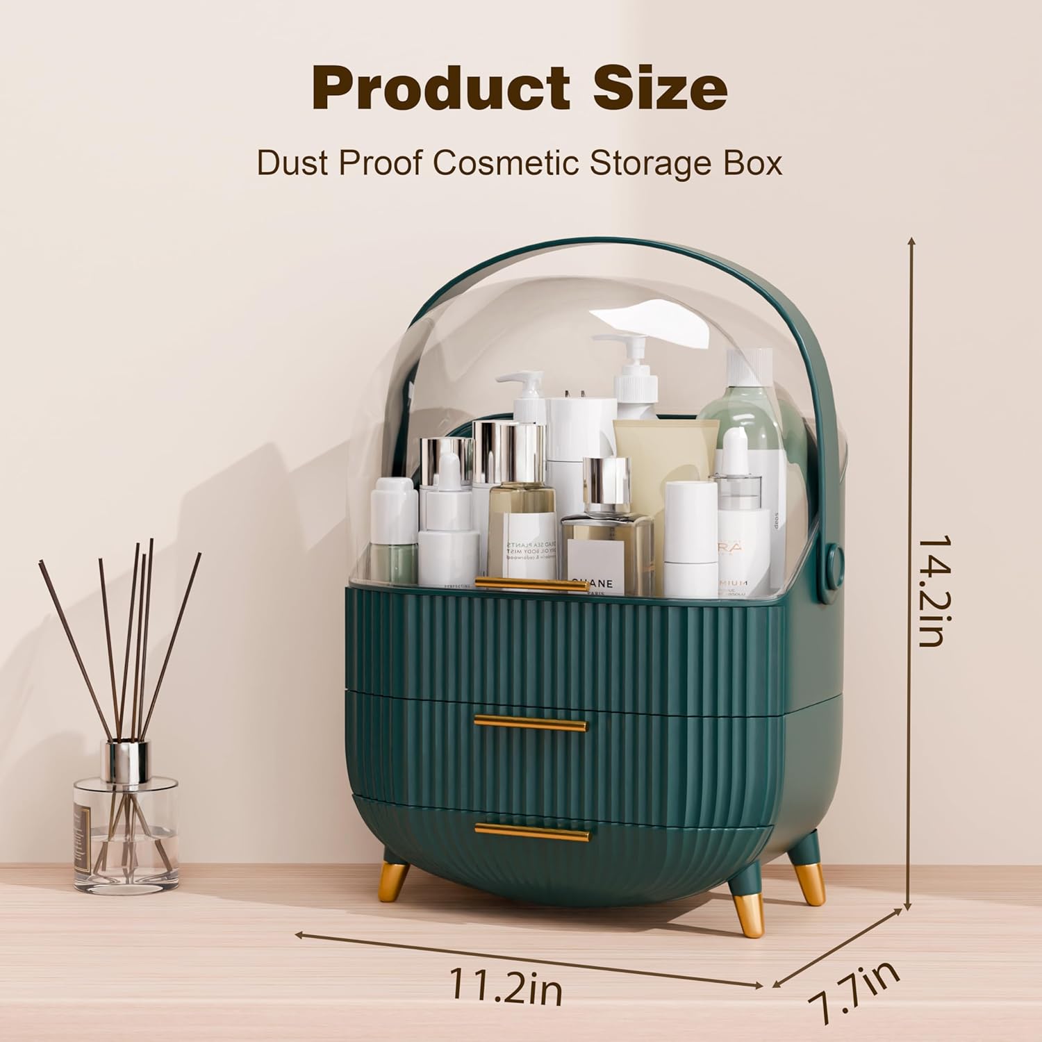 - [Chic and Contemporary Aesthetic]Enhance your living space with the sleek and modern design of this elegant makeup organizer. Adorned with a transparent acrylic protective cover and a delicate golden handle with non-slip feet, it adds a touch of sophistication to any home decor. Elevate your makeup corner with its stylish aesthetic and functional design.