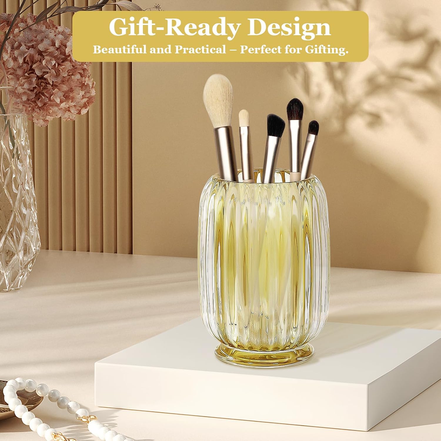 - Premium Thick Glass โ Crafted from top-quality thick glass for durability and a luxurious feel, this makeup brush holder keeps its shape and clarity for years of use, while the heavy base prevents tipping