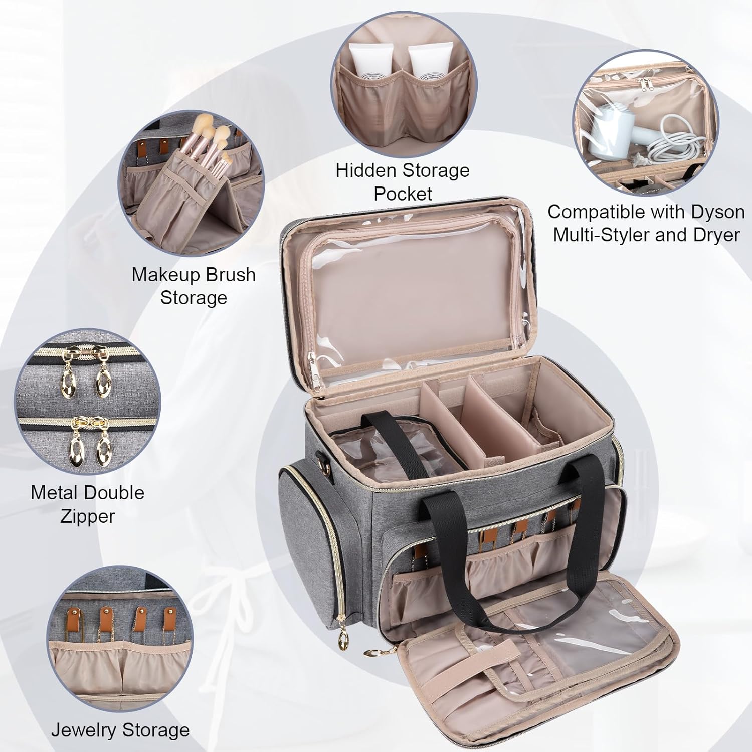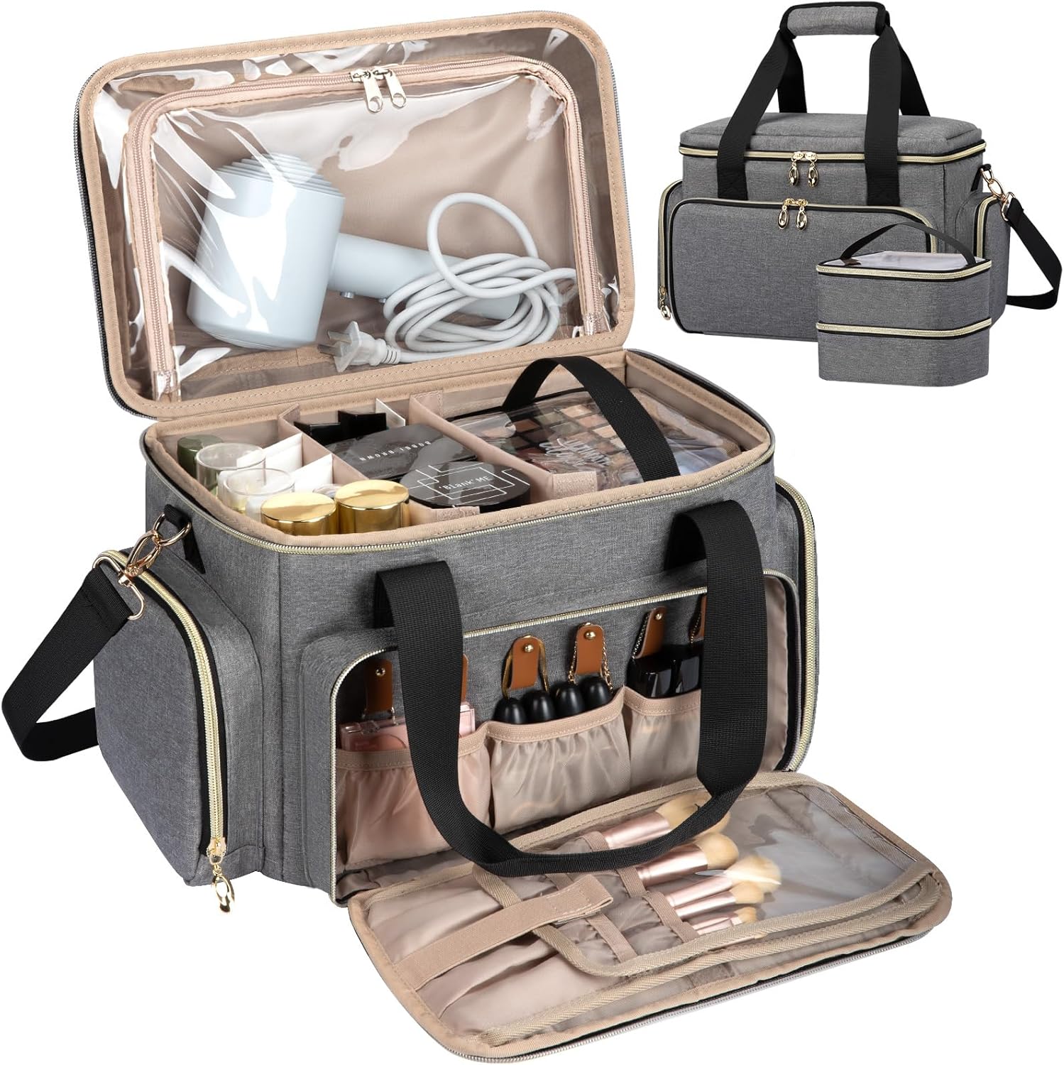 - Well-organized Compartments: The main compartment has two flexible, removable dividers that can store cosmetics of various sizes. The main compartment has 2 inner small pockets and 2 clear toiletries pouches for neatly storing your cosmetics and travel toiletries. The spacious transparent pocket at the top can hold small hair straighteners and other hair care products