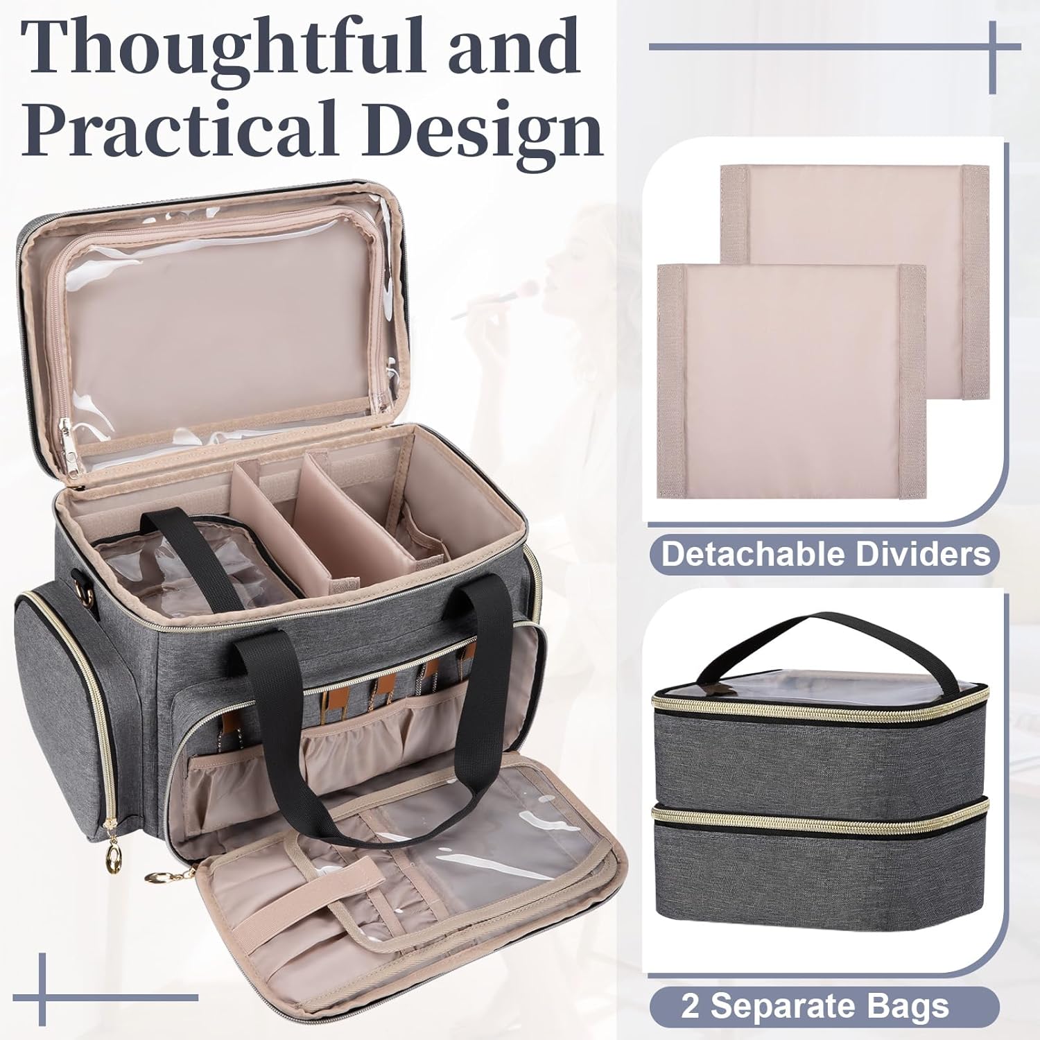 Large Makeup Bag, Portable Travel Makeup Bag Organizer for Women Girls with 2 Removable Pouches & Detachable Dividers, Cosmetic Travel Bag, Toiletry Bag for Makeup and Hair Supplies Grey